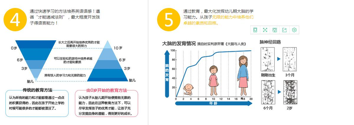 课程特色:通过右脑胎教、运动胎教、营业胎教、艺术胎教课程加深母子一体感,唤醒宝贝天才右脑潜能。