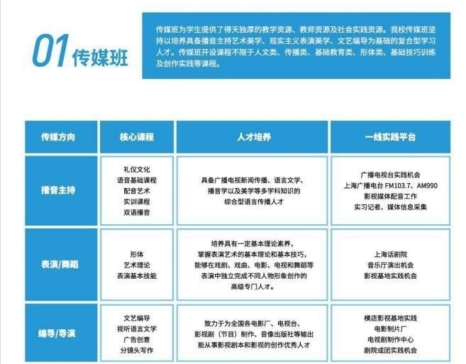 上海英创学院艺考部拥有全新的、独具适应性的艺考特色班级。学校成熟的课程体系及实施体系惠及全体学生;我校坚持以艺术审美育人、将美育与课堂结合,并以此为基础形成别具-格的国内普高教育艺考部。上海英创学院艺考部师资团队是由全国高等艺术院校导师与艺术家组成。艺考部的课程(包括传媒方向、美术与设计)全程由上戏教授、美院杰出青年毕业生授课。学生就读后可参加国内艺考,所选专业升学方向对标全国各大艺术类高校(如:中国传媒大学、北京电影学院、上海戏剧学院、中央戏剧学院等)。学校拥有独立的多媒体教室、画室、影视后期工作室以及琴房等,为艺考的学生提供了独立、聚焦的学习和创作空间。