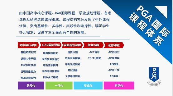 上海市大同中学国际部PGA高中国际课程是由PGA全国管理办公室联合美国ACT Education Solutions共同研发,是融合中西教育优势的高中国际课程体系。其核心理念:保留中国传统高中课程教育精髓部分,融合美国先进教育理念和模式。