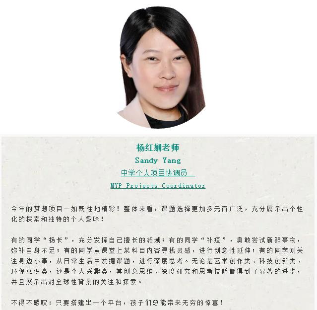 我们除了感谢所有相关指导教师和协调员在此个人设计项目过程中对孩子们所做的悉心引导,也衷心希望在未来的日子里,我们年轻的学子将继续携手创意与思考,以自信而坚定的步伐走向明日的成功!