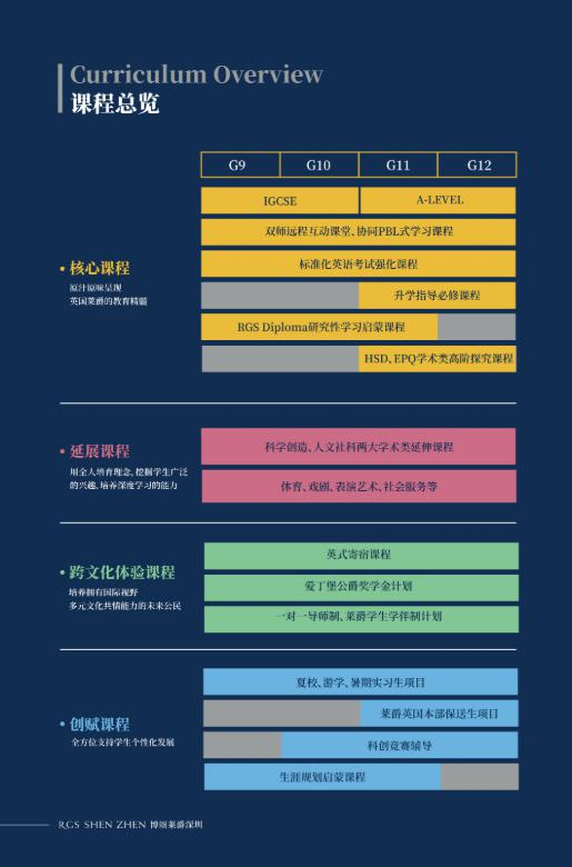 选用英式经典、全球普遍认可的IGCSE与A-Level课程。IGCSE与A-Level阶段的学习都为两年制,包含核心课程、延展课程、创赋课程三个选课板块,分为必修课、选修课与学生社团三种授课形式。课程的开设皆以学习者为中心,采用小班化教学,师生比1:5,并使用一贯制的教研与综合评估体系,确保呈现最优的教学品质。