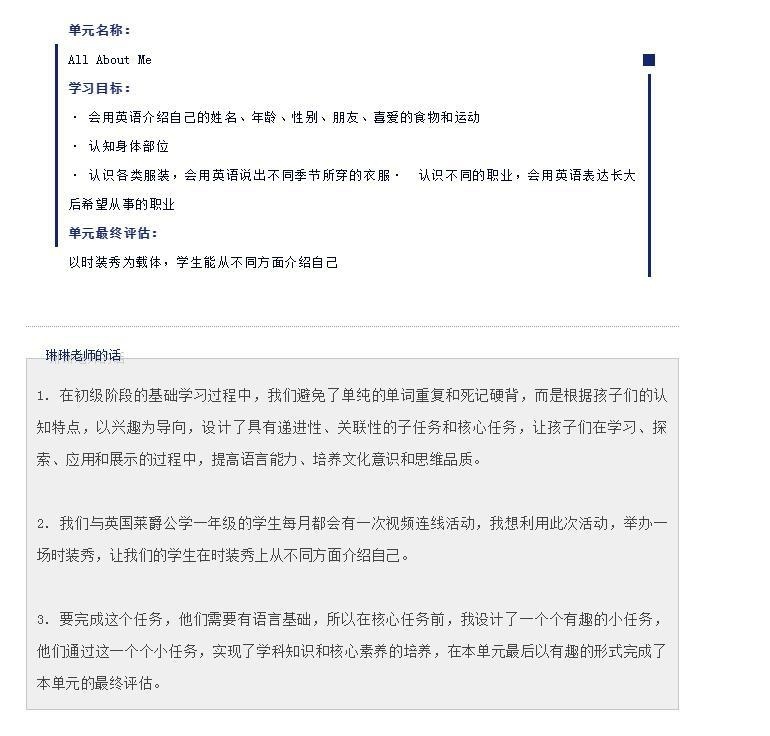 英语课程的学习,既是学生通过英语学习和实践活动,逐步掌握英语知识和技能,提高语言实际运用能力的过程,又是他们磨砺意志、陶冶情操、拓展视野、丰富生活经历、开发思维能力、发展个性和提高人文素养的过程。在本单元的学习中,老师一直在搭建脚手架,创设教学情境,激发孩子的兴趣和对探究事物的渴望,让孩子自发地参与到活动中,通过一系列子任务和核心任务,基本达成单元学习目标,孩子们的核心素养亦得到有效地锻炼、提升和展示。