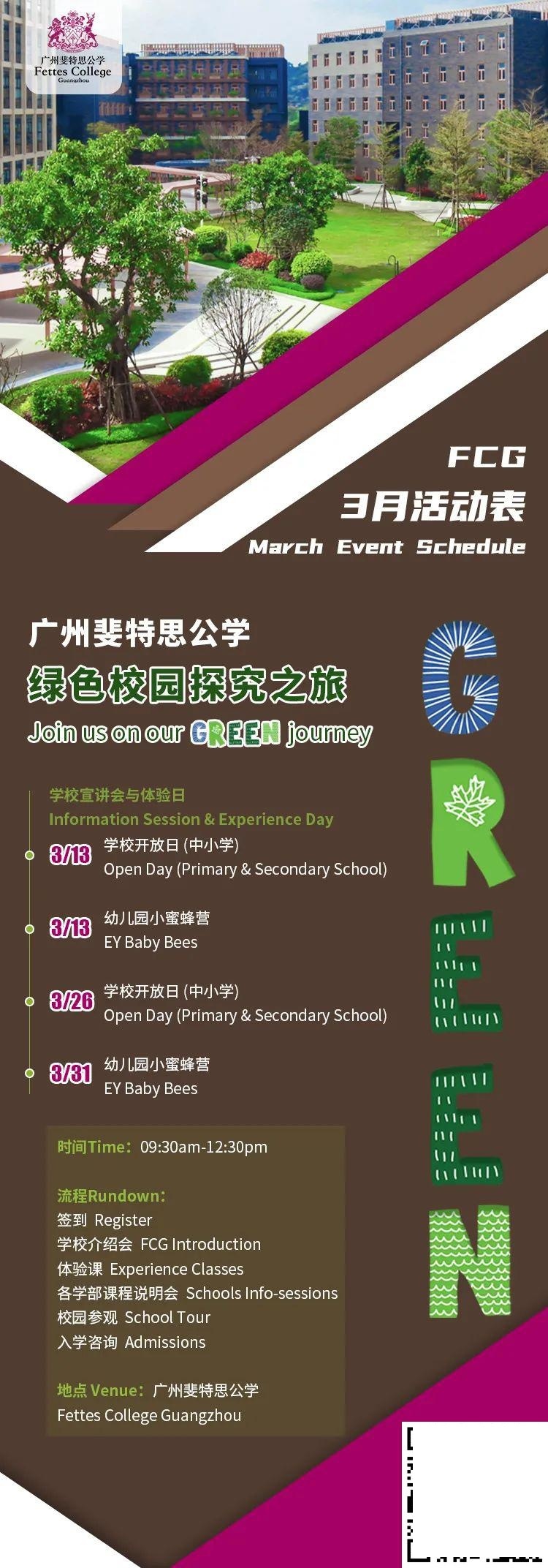 FCG办学理念和特色,解读15 年一贯制的课程优势、升学衔接课程、升学规划、“双减”政策下的家庭教育、博实乐教育集团提供的教育资源等内容。我们的活动丰富多样,深受校内外家长们的欢迎与好评。三月,占地200亩的广州斐特思公学(FCG)“大公园”诚邀您与孩子一同开启本月的绿色探究之旅 。