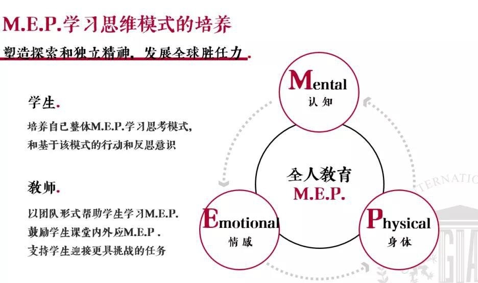 M.E.P.学习思维是一个带有内驱动力的学习思维方式,Emotional情感 是帮助学生重塑自我的思维力。GIS强调无论是在学科教学还是在德育渗透上,都更加注重对学生学习方法、思维方式以及可迁移技能的养成。