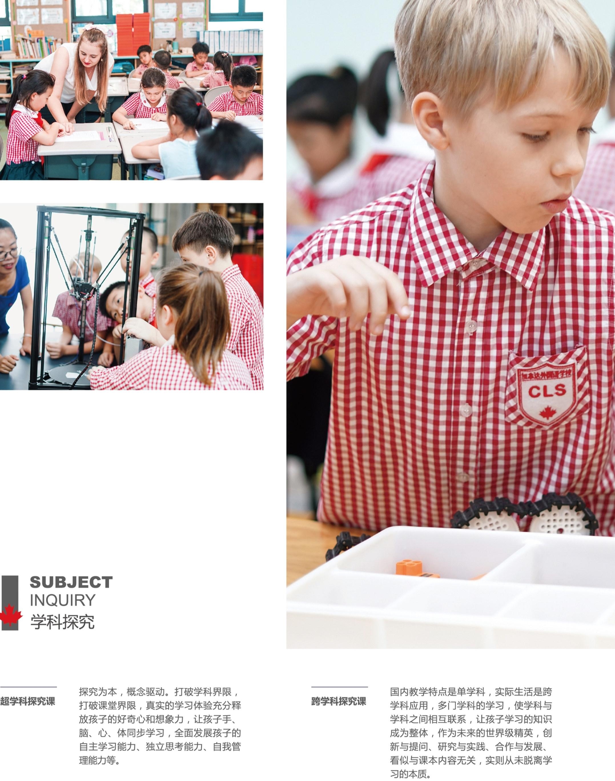 跨学科探究课:国内教学特点是单学科,实际生活是跨学科应用,多门学科的学习,使学科与学科之间相互,让孩子学习的知识成为整体,作为未来的世界级精英,创新与提问、研究与实践、合作与发展、看似与课本内容无关,实则从未脱离学习的本质。
