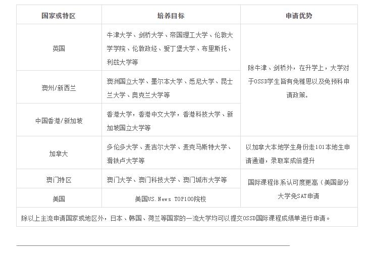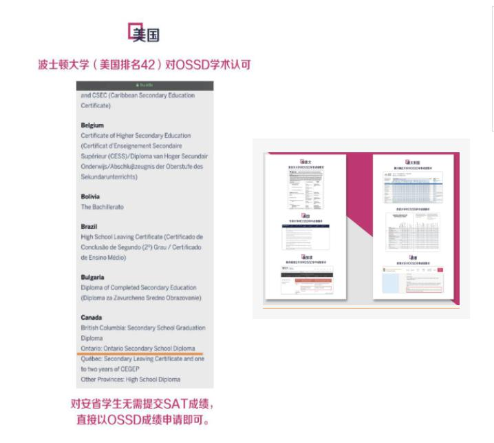 覆盖面广:全球150+国家与地区,超万所大学均接受OSSD高中成绩申请。入学注册海外学籍:颁发全球统一的学分学历,获得加拿大安省教育厅授予本地生学籍编号,获得安省101本地学生专属大学申请通道;获得加拿大安省高中毕业证书。差异化教育:着重发展优势,让学生在擅长和有兴趣的领域更加优秀,出类拔萃。GPA易拿高分,杜绝“一考定终身”:每门课程通过15次(含平时作业70%+期末30%)进行成绩的评估,评估机会多,易拿高分,完美诠释用过程缔造结果。接受转学分,入读学制灵活:最长学制3年,最短1年。选择6门擅长科目作为大学申请课程项目宗旨:学生毕业率100%、世界名校录取率100%,世界前100学校录取率超过70%,世界前200名校录取率100%OSSD成绩受全球大学认可,且全球50+大学接受免雅思、免预科入读