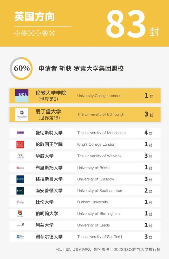 在英国方向,我校2022届毕业生共斩获83封大学Offer,60%申请者获得英国罗素大学集团盟校青睐。