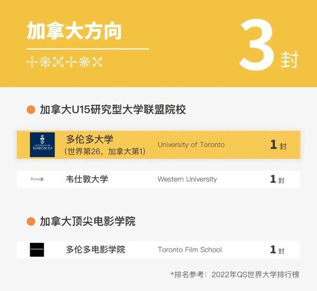 在加拿大方向,今年的录取比去年更出色,我们共斩获了3封Offer,2封来自加拿大U15研究型大学联盟,1封来自加拿大电影学院(多伦多电影学院)。