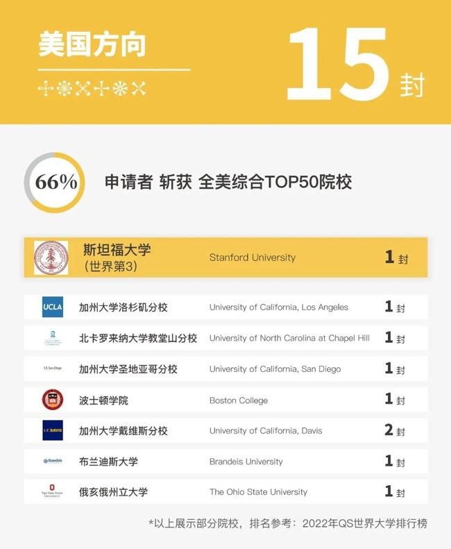 在美国方向,我们共斩获15封大学Offer,其中66%申请者获得全美综合排名前50名院校的青睐。
