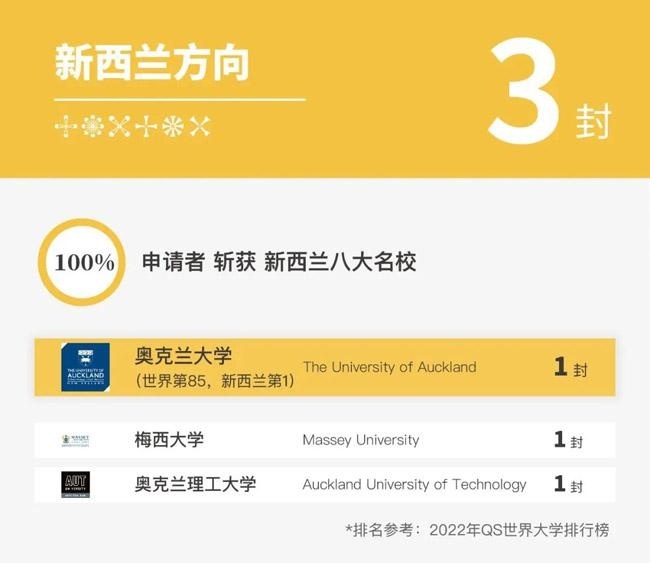 奥克兰大学综合排名常年位居新西兰,2022年在世界排名第85,被誉为新西兰“国宝级”大学;梅西大学,常年位于新西兰全国大学前五位,拥有全新西兰的商学院;奥克兰理工大学是世界前1%大学,并于澳大拉西亚地区千禧大学中排名第1位,全球研究影响力新西兰排名第1位,国际视野新西兰排名第1位。