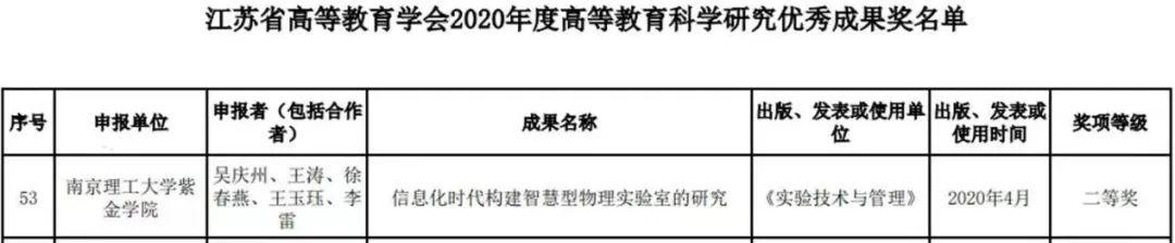 近日,江苏省高等教育学会2020年度高等教育科学研究成果奖公布评选结果,我校吴庆州、王涛、徐春燕、王玉珏、李 雷五位老师的研究成果《信息化时代构建智慧型物理实验室的研究》获省级二等奖。