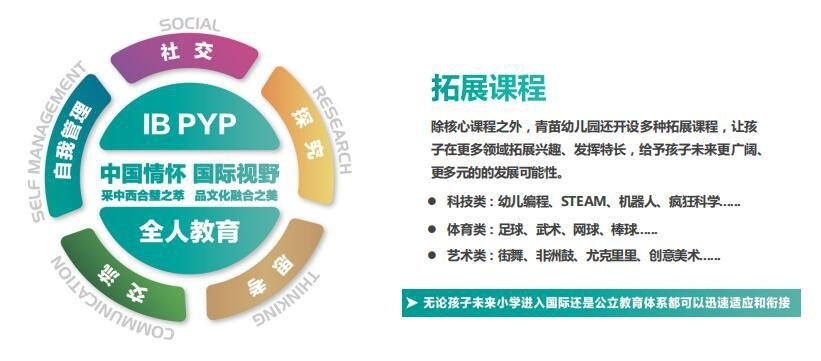 青苗国际幼儿园课程由中外教育专家团队共同研发,经过20余年不断完善和发展,结合IBPYP探究式学习和全人教育的理念,围绕社交、探究、思考、交流、自我管理等多个层面,致力于在幼儿智能发育的关键期,养成良好习惯、培养学习兴趣、激发个人潜能,从而实现全面均衡的发展。
