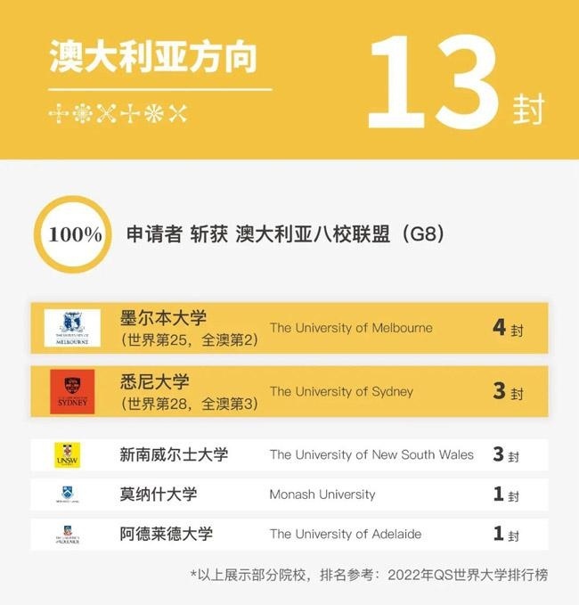 今年,我们有5位同学将澳大利亚作为考虑国家之一,总计13封Offer中有11封来自QS世界排名前50大学。