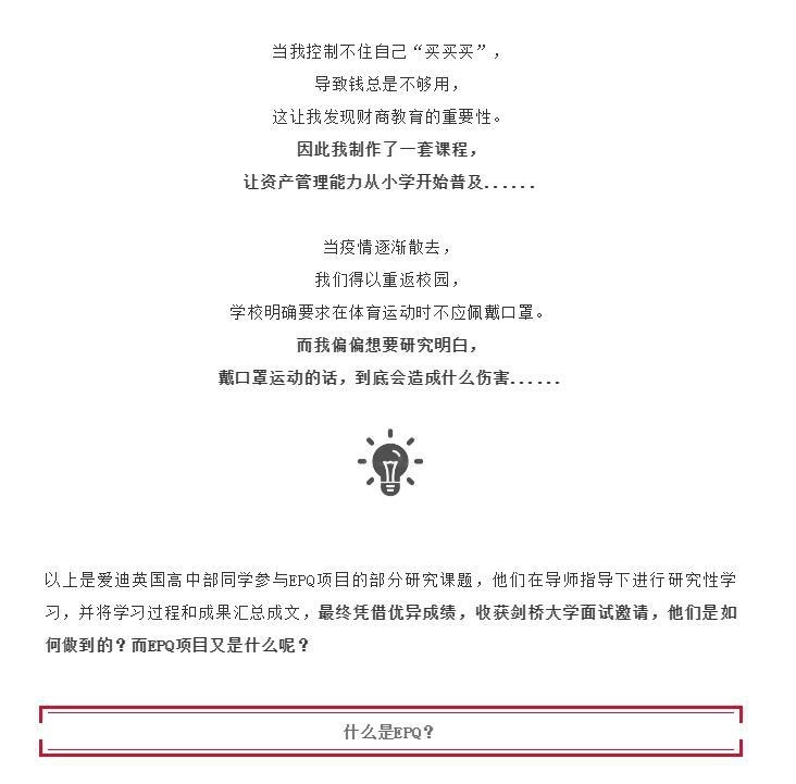 谈到“缺憾”,王钰涵说,其实仅仅一次EPQ项目完全不足以为他的选题找到解答,然而在这个过程中经历的挫折与磨难,才是真正的收获所在。 他在时间管理上找到了适合自己的步伐,逻辑思维的能力也得到了前所未有的锤炼,当他将EPQ的项目经历写进自己的英国大学申请PS,并就这一选题与剑桥大学的面试官侃侃而谈,这次经历便已经一笔一划刻进了他的成长故事。